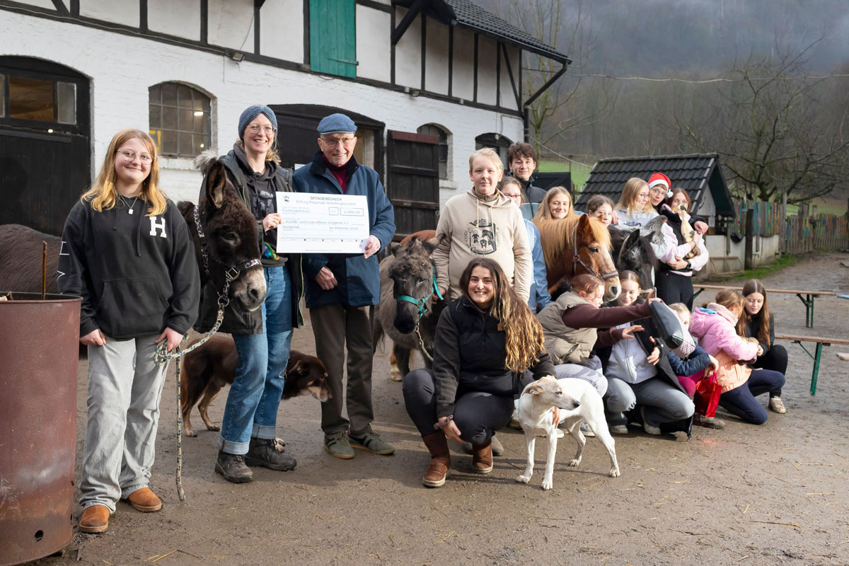 Die Übergabe fand am 20.12.2025 statt. Das Foto zeigt Herrn Roland Schmidt vom Vorstand der Stiftung, Kinder, Tiere und Team-Mitglieder der Farm.